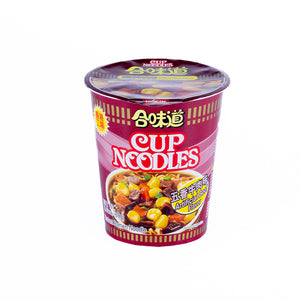 Wheat Flour, Palm Oil, Modified Tapioca Starch, Dehydrated Vegetables (Corn, Carrot, Green Onion), Salt, Textured Soy Protein [Soy Protein, White Sugar, Salt, Monosodium Glutamate, Palm Oil, Autolyzed Yeast Extract, White Pepper Powder, Caramel Color, Tocopherols (Preservative), Ascorbyl Palmitate (Preservative)], Artificial Flavor, Monosodium Glutamate, Soy Sauce Powder (Soybeans, Wheat, Salt), Onion Powder, Maltodextrin, White Sugar, Autolyzed Yeast Extract, Garlic Powder, Calcium Carbonate, Caramel Color, Hydrolyzed Soy Protein, Five Spices Powder (Star Anise, Cinnamon, Sichuan Pepper, Fennel, Anise, Clove), Dextrose, Potassium Carbonate, Black Pepper Powder, Sodium Tripolyphosphate, Guar Gum, White Pepper Powder, Ginger Powder, Sodium Carbonate, Disodium Guanylate, Disodium Inosinate, Citric Acid, Non-Dairy Creamer [Glucose Syrup, Hydrogenated Palm Oil, Sodium Caseinate (a Milk Derivative), Potassium Phosphate Monobasic, Mono- and Diglycerides, Silicon Dioxide], Tocopherols (Preservative)