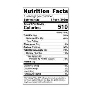 NOODLE: Wheat Flour, Palm Oil, Tapioca Starch, Starch Acetate, Salt, Wheat Gluten, Compound Acidity Regulator (Potassium Carbonate, Sodium Carbonate, Sodium Hexametaphosphate, Sodium Dihydrogen Phosphate, Sodium Tripolyphosphate, Sodium Pyrophosphate, Monosodium Glutamate, Disodium 5-Ribonucleotides), Compound Thickener (Isolated Soy Protein, Xanthan Gum, Sodium Alginate, Whole Egg Powder), Sodium Carboxy Methyl Cellulose, Compound Antioxidant (Tocopherol, Arabic Gum, Mono- and Diglycerides of Fatty Acids), Compound Color (Curcumin, Riboflavin) SAUCE PACKET: Palm Oil, Scallion, Garlic, Salt, Ginger, Monosodium Glutamate, Artificial Flavoring, Chili, Tocopherol POWDER PACKET: Salt, Monosodium Glutamate, Maltodextrin, Spices, Sugar, Artificial Flavoring, Yeast Extract, Acid-Hydrolyzed (Soy, Corn) Protein Compound Powder, Disodium 5’-Ribonucleotides, Caramel Color FLAKES: Dehydrated Carrot, Flavored Vegetable Protein Cube (Soy Bean Meal, Wheat Gluten, Isolated Soy Protein, Fermented Soy Sauce (Water, Soybeans, Salt, Caramel Color, Wheat, Sugar, Monosodium Glutamate, Button Mushroom), Corn Starch, Spices, Yeast Extract, Disodium 5’-Ribonucleotides), Dehydrated Scallop