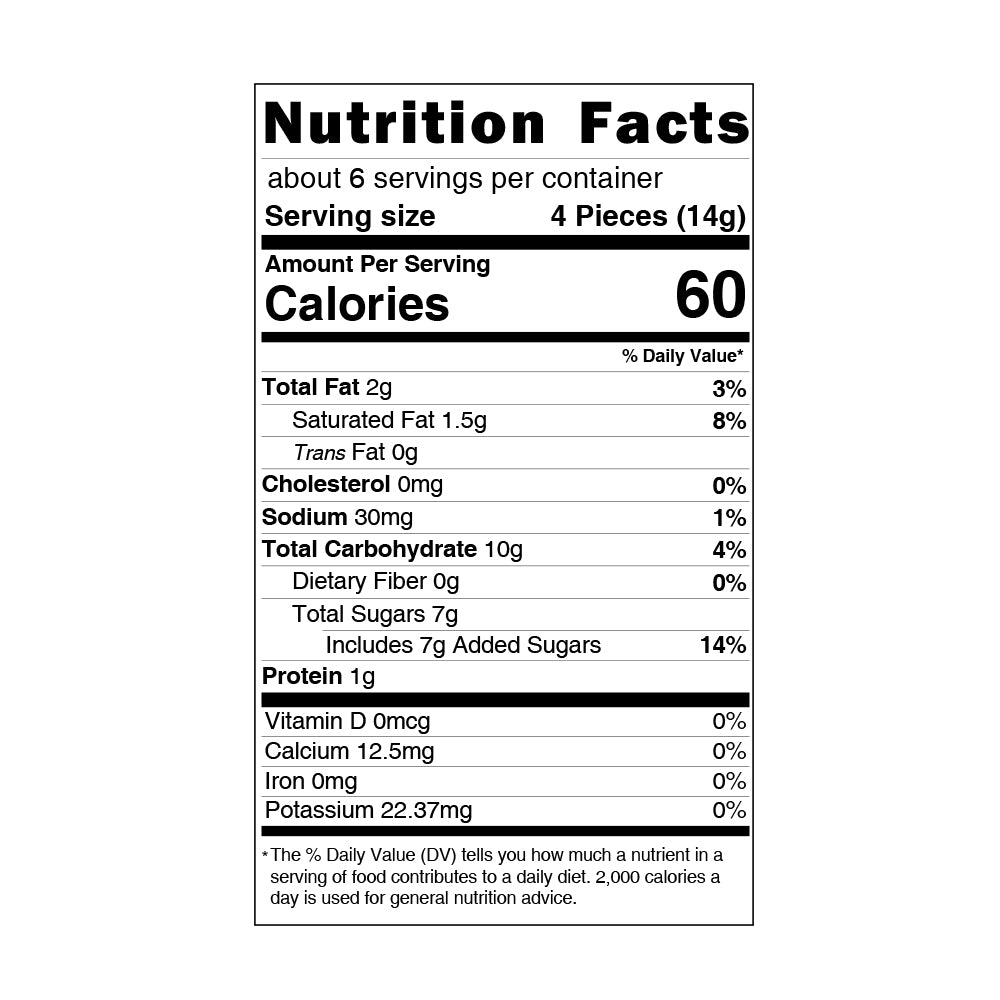 Corn Starch Syrup, Condensed Milk, Sugar, Vegetable Oil (Hydrogenated Coconut Oil), Milk Cream, Whey, D-Sorbitol, Gelatin, Soy Protein, Distarch Phosphate, Sugar, Pullulan, Salt, Corn Starch, Emulsifier (Sorbitan Esters of Fatty Acids, Soy Lecithin), Blended Edible Oil (Rapeseed Oil, Palm Oil), Palm Oil, Camauba Wax, Tocopherol, Artificial Flavors, Milk, Vitamin E