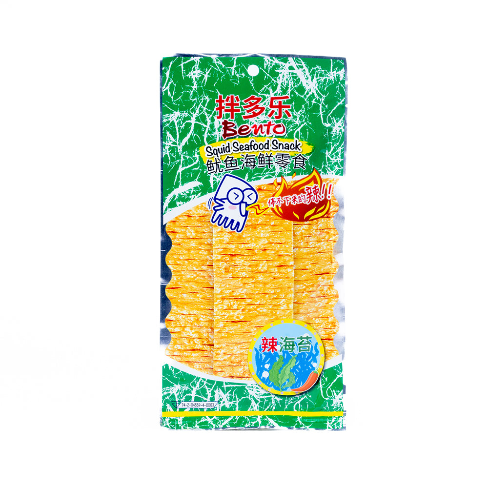 Squid, Surimi (Minced Fish Meat), Wheat Flour, Sugar, Tapioca Starch, Soy Sauce, Fructose, Nori Seasoning, Wheat Gluten, Chili Powder, Salt Flavor Enhancer (Monosodium L-Glutamate (E621), Disodium 5'-Ribonucleotides, Glycine (E635, E640)), Artificial Flavor (Crab Flavour, Capsicum)